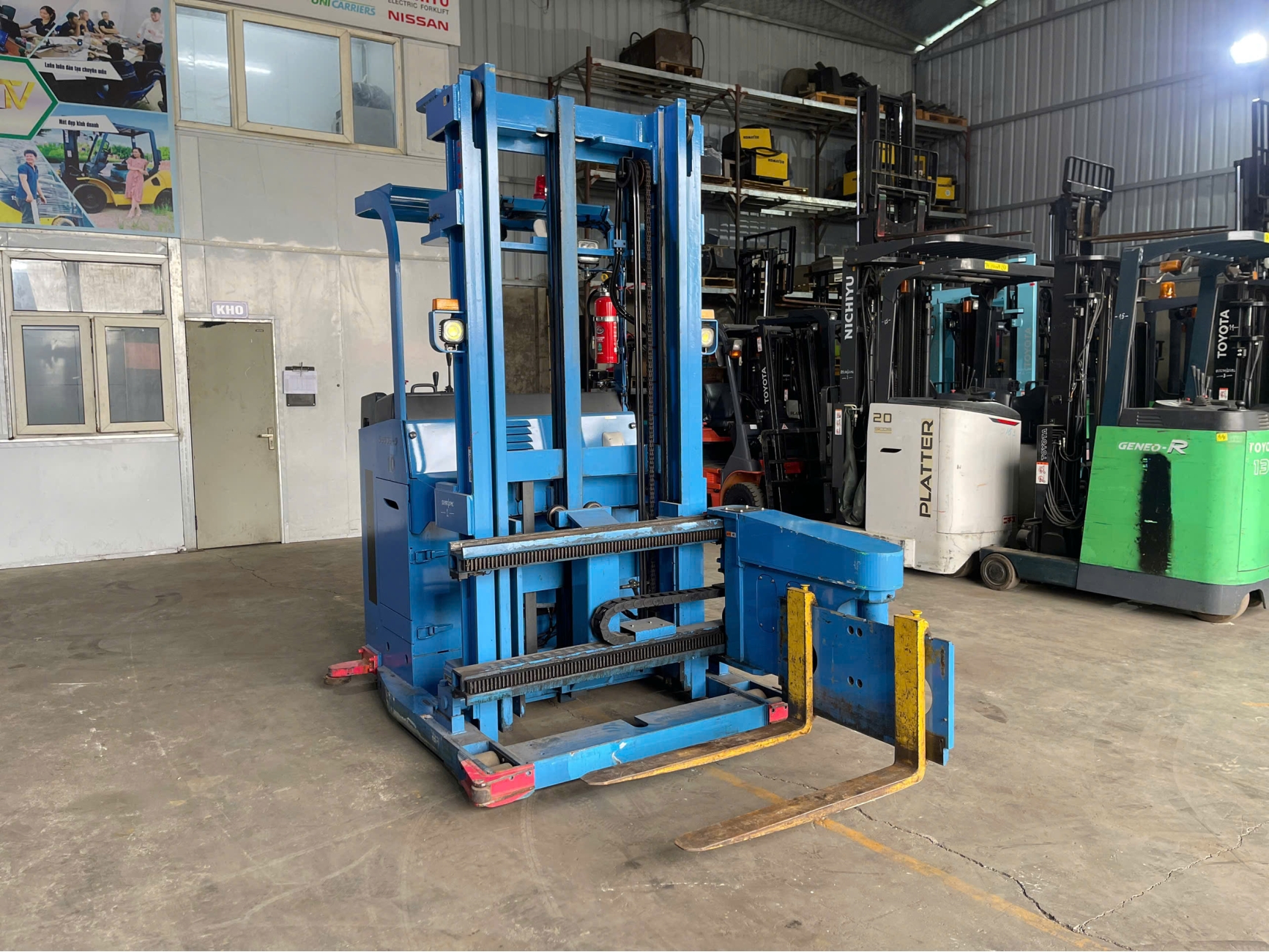 • Kho có lối đi hẹp hoặc cần nâng hàng lên giá kệ cao từ 3–4m.